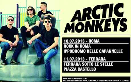 Ottime notizie per i fans degli Arctic Monkeys: la band torna in Italia nel 2013. Il tour del gruppo di Sheffield capitanato da Alex Turner, prevede 2 concerti nel belpaese ovvero a Roma e Ferrara.