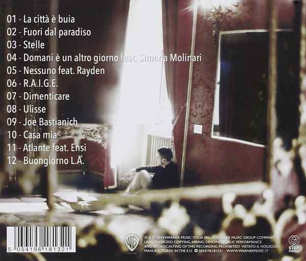 L’opera propone dodici tracce, più un pezzo bonus disponibile in esclusiva su iTunes. Tra le canzoni presenti, cito i primi 2 singoli estratti Fuori dal Paradiso, accompagnato da un filmato uscito il 5 maggio, e Dimenticare, il cuo official photo video è stato caricato su Youtube proprio ieri. Il disco propone dodici canzoni inedite, che fotografano lo stato d’animo del rapper.