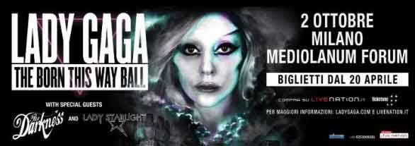 Il 2 ottobre 2012, il The Born This Way Ball di Lady Gaga sbarca a Milano. Il concerto si svolgerà al Mediolanum Forum di Assago ed è ancora caccia ai biglietti che inizialmente sembravano esauriti; tuttavia nelle ultime ore vi è stata una nuova disponibilità dei tagliandi.