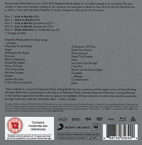 L’opera è disponibile in 2 CD denominati Live in Berlin Soundtrack, in download digitale con le 21 tracce live dei 2 CD, che tuttavia non includono soltanto la performance dei brani tratti da “Delta Machine”, ma anche alcune hit più famose del gruppo inglese di musica elettronica come “Personal Jesus” ed “Enjoy The Silence”, e nella versione cofanetto deluxe 3 CD + 2 DVD che oltre ai 2 citati dischi, include anche il menzionato film-DVD Live in Berlin, ed un secondo DVD denominato “Alive In Berlin” diretto sempre da Corbijn che da tempo collabora con la band, più il Blu-Ray dell’ultimo album Delta Machine (dovrebbe essere la versione deluxe con 17 tracce) con audio 5.1. Tutti questi contenuti saranno forniti in una bella scatola contenente 5 mini-copertine di CD e un libretto formato da 16 pagine.
