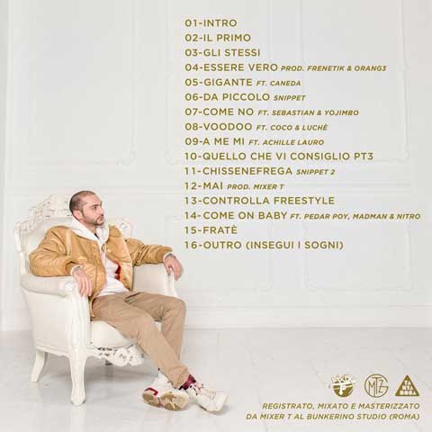 La copertina è stata curata da Nicolò Dante. Appena dopo la cover frontale, trovate i titoli degli altri quindici brani inclusi nel progetto, che sarà seguito da un atteso tour (nella pagina Facebook di Gemitaiz, sono disponibili le date).