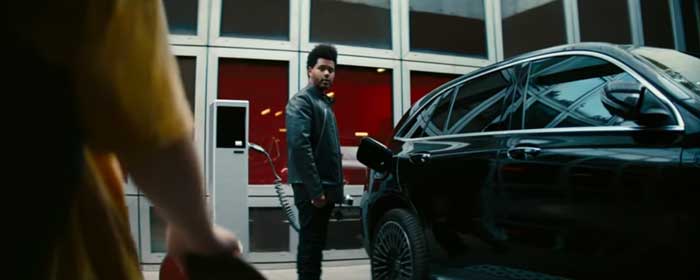Nello spot, che sarà quindi disponibile nella sua versione integrale dal 29 novembre, vediamo l’artista caricare con l’energia elettrica l’autovettura e un ragazzo che gli dice “Wow, guidi un’auto elettrica?”. Successivamente Abel è alla guida di quest’automobile ed esclama “Hey Mercedes, play Blinding Lights”.