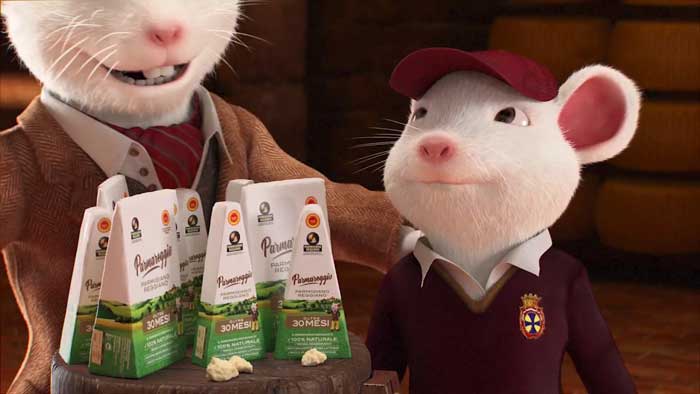 Papà, come si fa il Grattugiato Parmareggio? E armato di chitarra papà topo canta: “Lasciatemi cantare, col parmigiano in mano, lasciatemi gustare il Grattugiato piano piano, è tutto naturale perciò ne vado fiero, io sono Parmareggio, un Grattugiato vero.”.