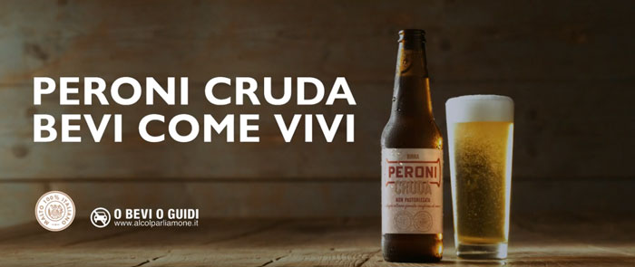 Da giugno 2019 è on air il nuovo spot della birra Peroni Cruda, quello che recita “Gioca Crudo. Ama Crudo. Respira Crudo. Lavora Crudo. vivi Crudo. La vita ha più gusto quando la bevi cruda. Peroni Cruda non pastorizzata. Bevi come vivi.”.
